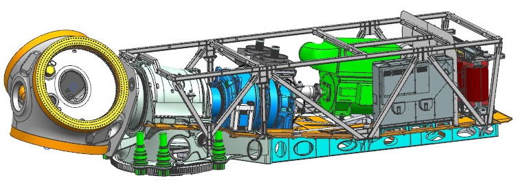 在國內(nèi)較早提出并應(yīng)用發(fā)電系統(tǒng)(發(fā)電機(jī)、變流器、干式升壓變壓器)上置技術(shù),集成電氣系統(tǒng)、冷卻系統(tǒng),機(jī)械承載結(jié)構(gòu)與動(dòng)力學(xué)分析。具有電纜數(shù)量少、易施工、塔內(nèi)線損少等優(yōu)勢(shì),免除箱變土建,減少整機(jī)和風(fēng)電場綜合成本。