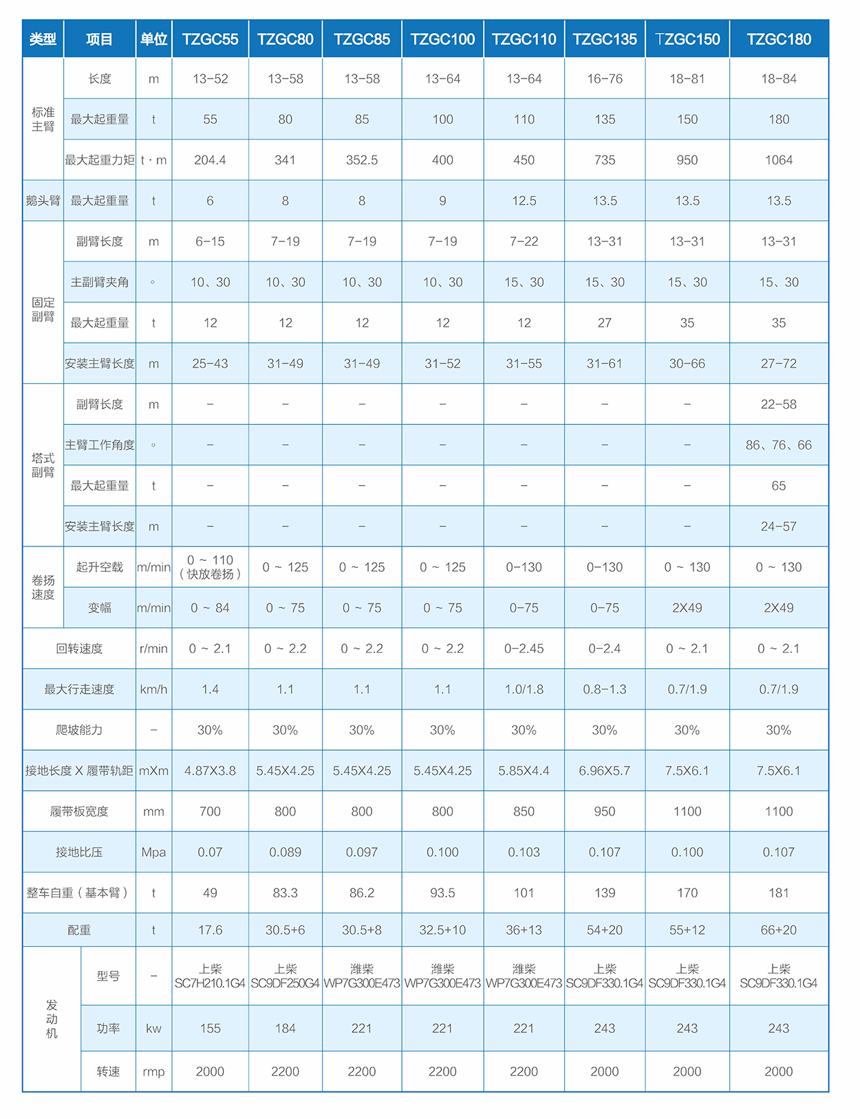 TZGC系列履帶起重機,產品涵蓋55-180t,微動性優(yōu)異、響應性快速、可靠性出色,整機性能行業(yè)領先。