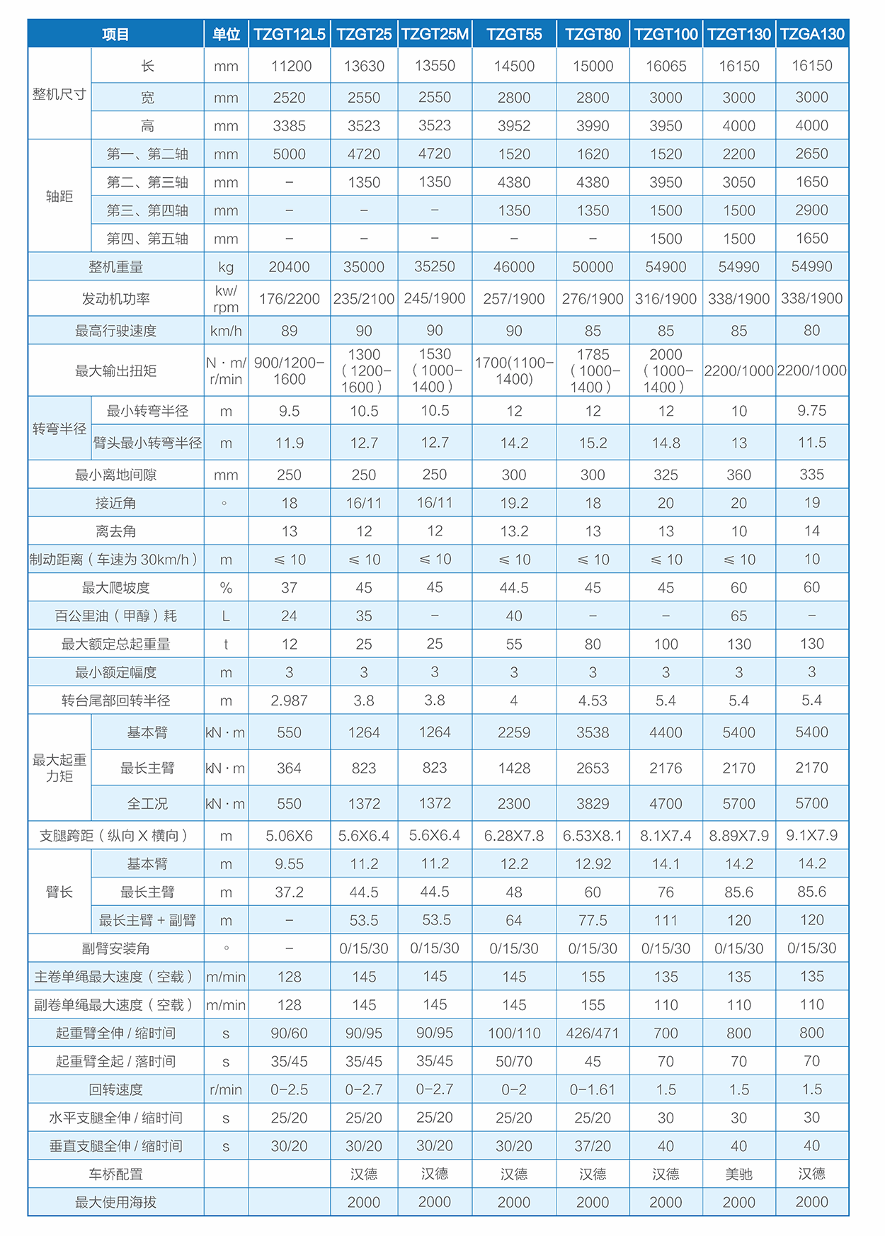 TZGT系列汽車起重機(jī)和TZGA系列全地面起重機(jī),產(chǎn)品涵蓋12-130t,整機(jī)性能行業(yè)領(lǐng)先