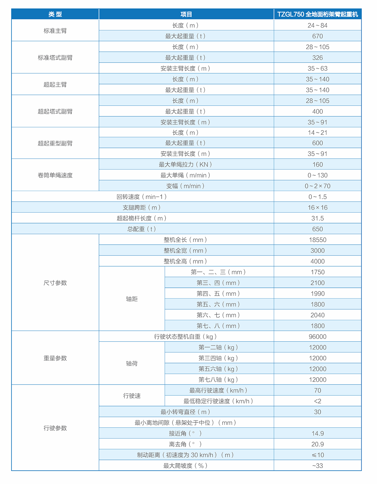 全地面桁架臂起重機,可廣泛應(yīng)用于風(fēng)電建設(shè)、橋梁建設(shè)、石油化工、市政工程等吊裝領(lǐng)域,滿足2.5MW~3.0MW風(fēng)機安裝和檢修的要求,是針對風(fēng)電安裝特別設(shè)計的一款高效率起重機。該類起重機上車采用同等噸位履帶起重機轉(zhuǎn)臺、臂架、超起系統(tǒng),下車采用重載全地面底盤,配置大跨度星型支撐液壓支腿用于起吊作業(yè)。整車配置有主臂、塔臂、超起主臂、超起塔臂、超起重型臂、基本風(fēng)電臂、超起風(fēng)電臂等工況。