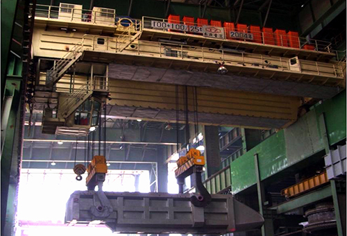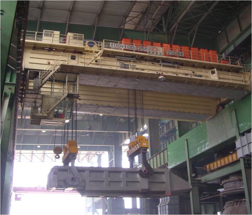 轉(zhuǎn)爐煉鋼過(guò)程中配置料箱起重機(jī),主要用于添加冷料作業(yè)。電爐加料起重機(jī)主要用于向電爐加廢鋼,與鑄造起重機(jī)主要區(qū)別在于主起升機(jī)構(gòu)可以不考慮單機(jī)工作的工況