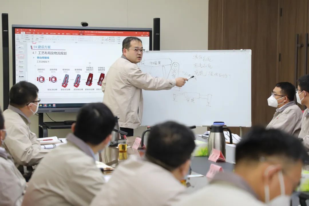 現(xiàn)場調(diào)研結(jié)束后,韓珍堂主持召開工程機(jī)械項(xiàng)目建設(shè)推進(jìn)會(huì)。組織參會(huì)人員現(xiàn)場畫圖、現(xiàn)場分析、精準(zhǔn)拆解、明確分工、制定工期,把會(huì)議開在實(shí)處,發(fā)現(xiàn)問題當(dāng)下推動(dòng)、當(dāng)下解決。