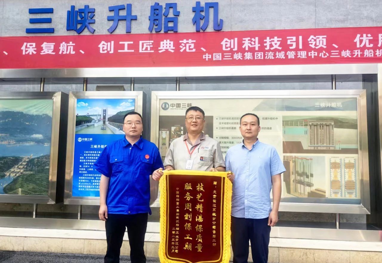 在三峽升船機2023年計劃性停航檢修項目總結大會上,公司服務人員雷明同志被評為“先進個人”稱號;一面寫著“技藝精湛保質量,服務周到保工期”的錦旗,展現用戶對于太重榆液售后服務工作的充分肯定和高度贊揚,“太重速度”為我國三峽項目的平穩(wěn)運行再立新功!