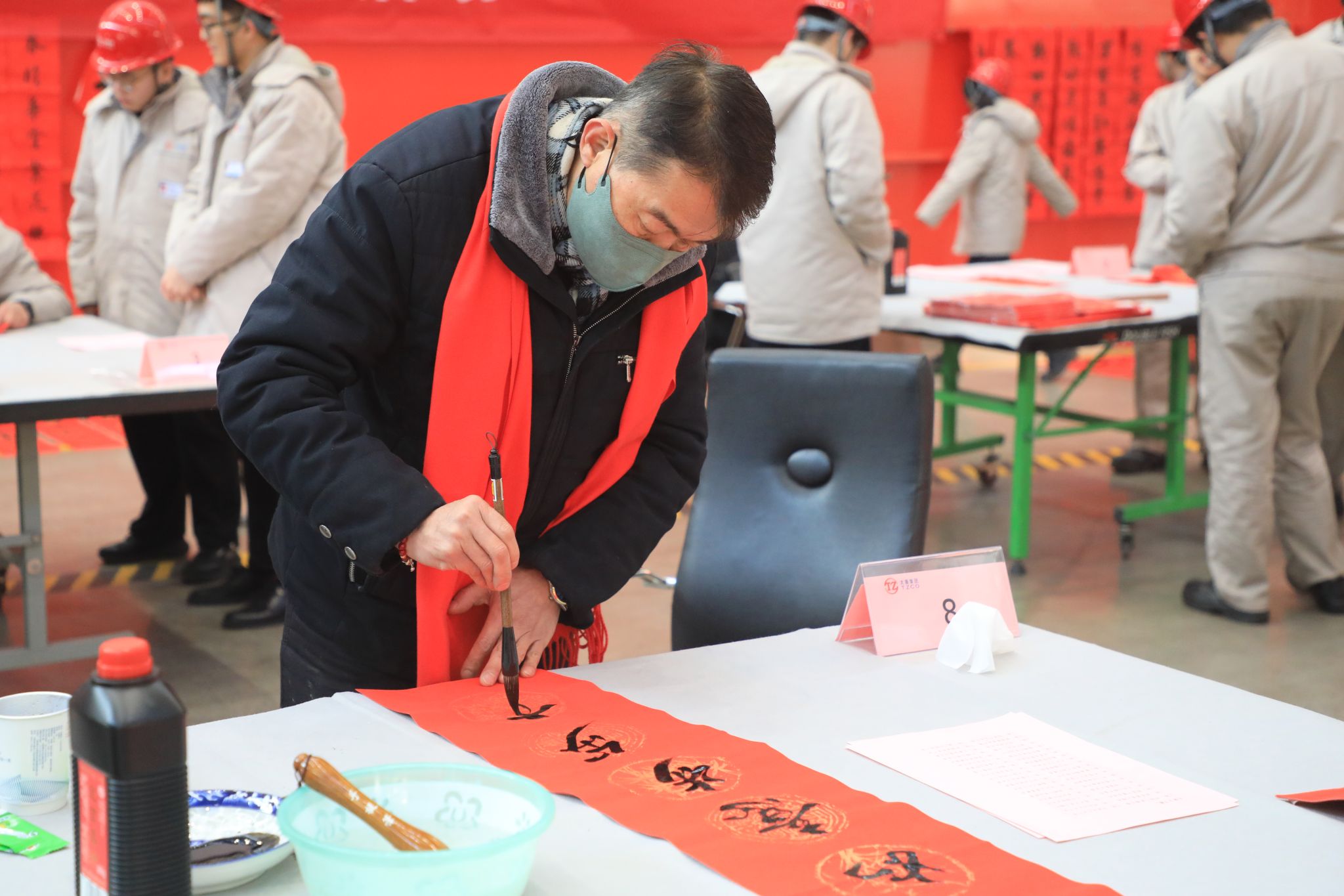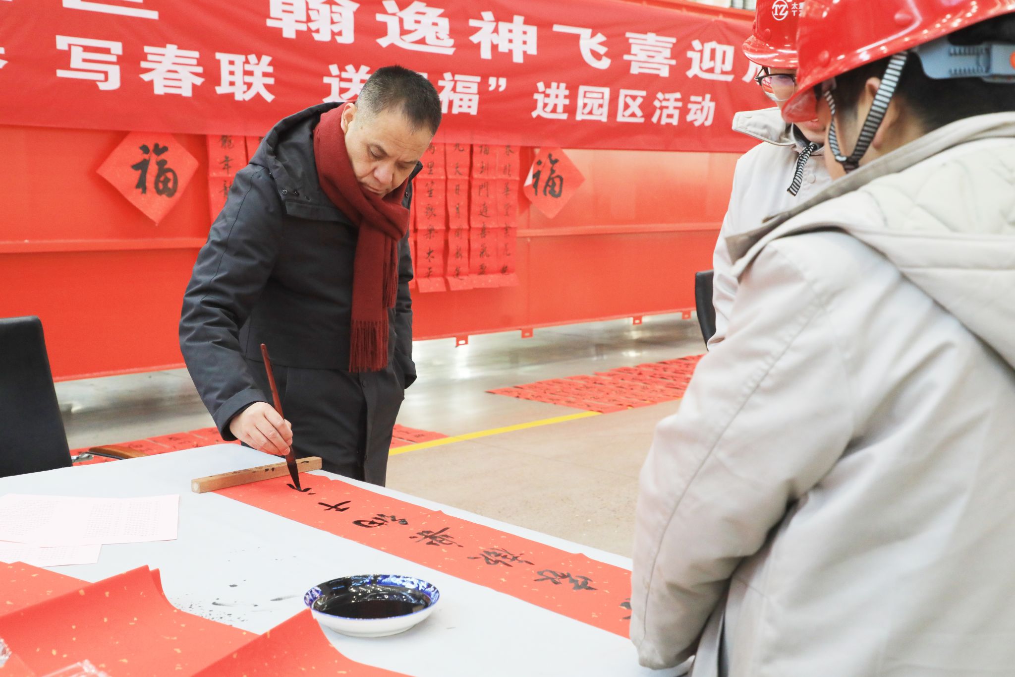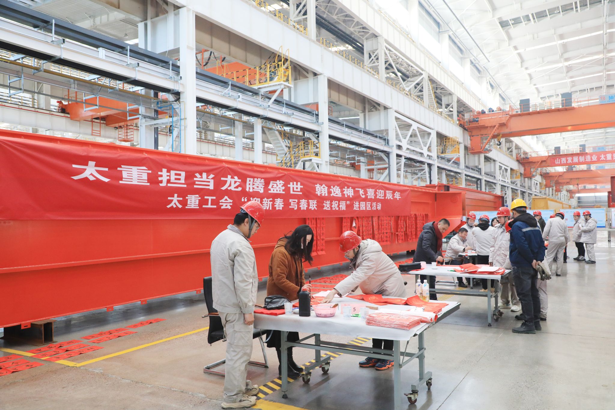 為豐富職工文化生活、喜迎龍年新春,1月23日,公司工會舉辦“迎新春 寫春聯(lián) 送祝?!边M(jìn)園區(qū)活動,在太重智能高端裝備產(chǎn)業(yè)園區(qū)加工裝配聯(lián)合廠房,來自省內(nèi)的知名書法家和公司書法愛好者們齊聚一堂,為各子分公司職工義務(wù)書寫春聯(lián),以這種喜慶的形式向廣大干部職工送上春節(jié)的祝福。集團(tuán)公司黨委專職副書記、副董事長、工會主席張新偉參加活動。