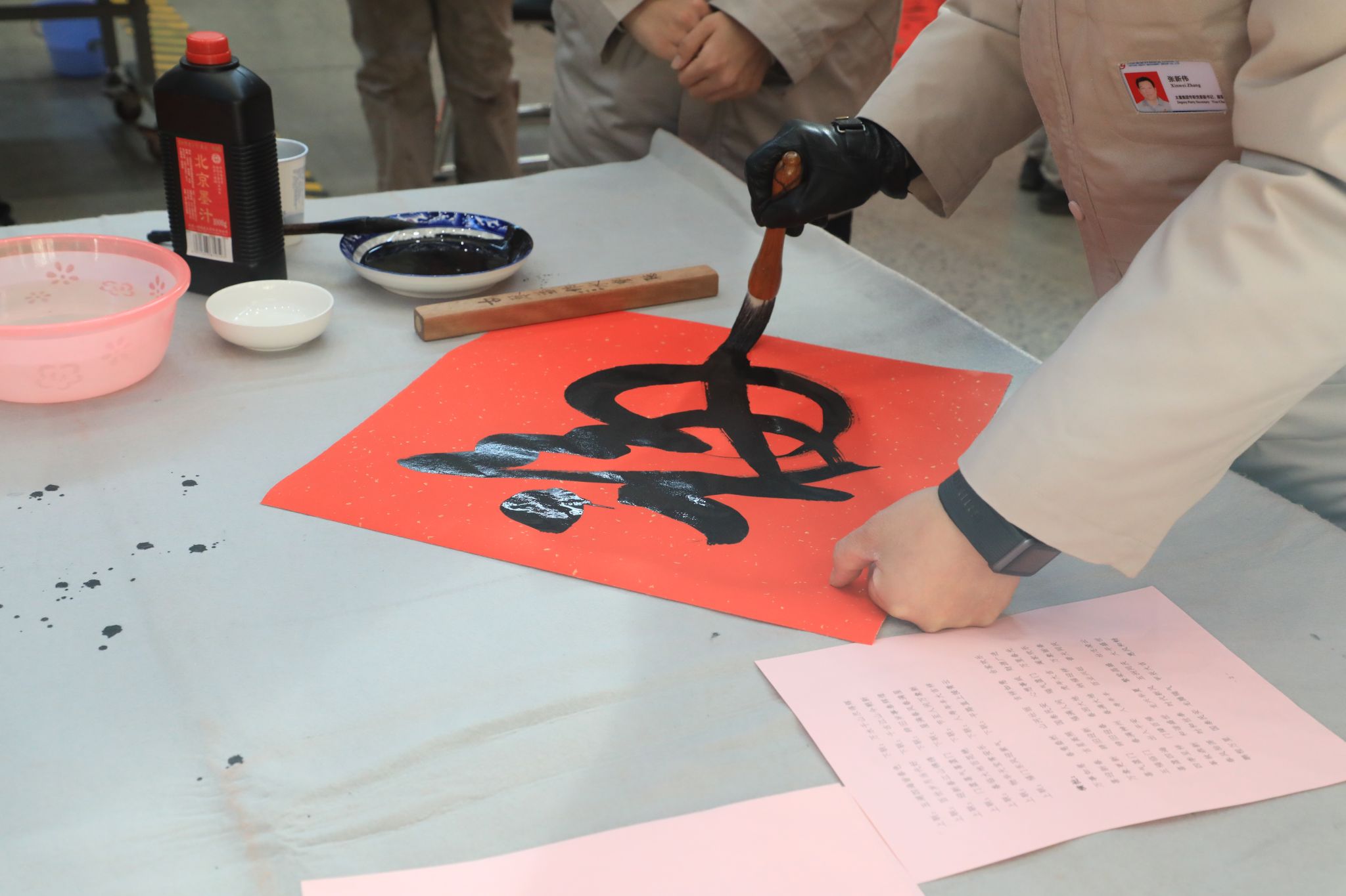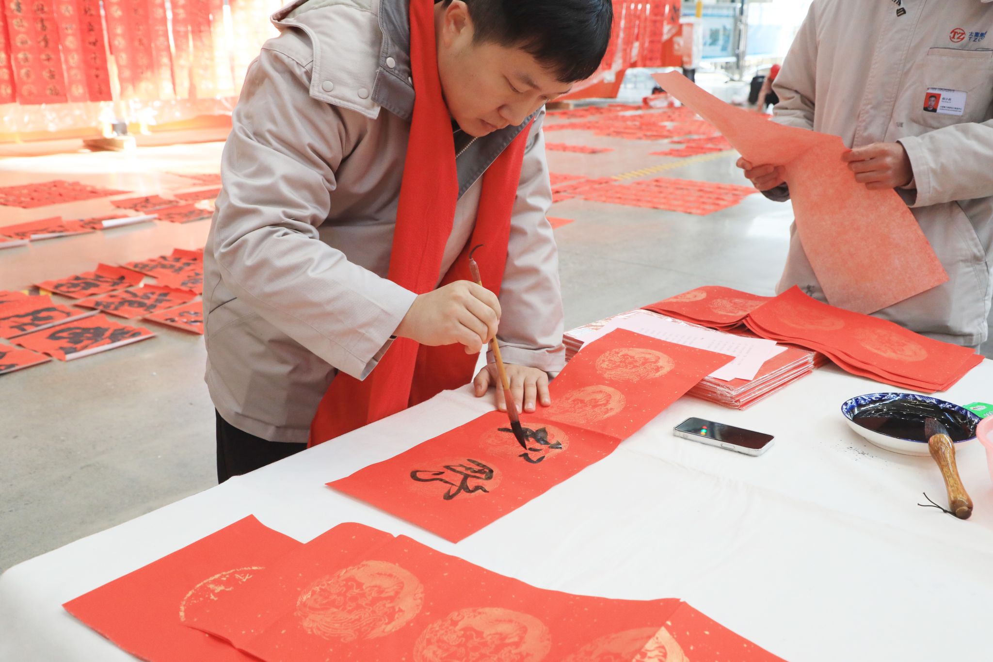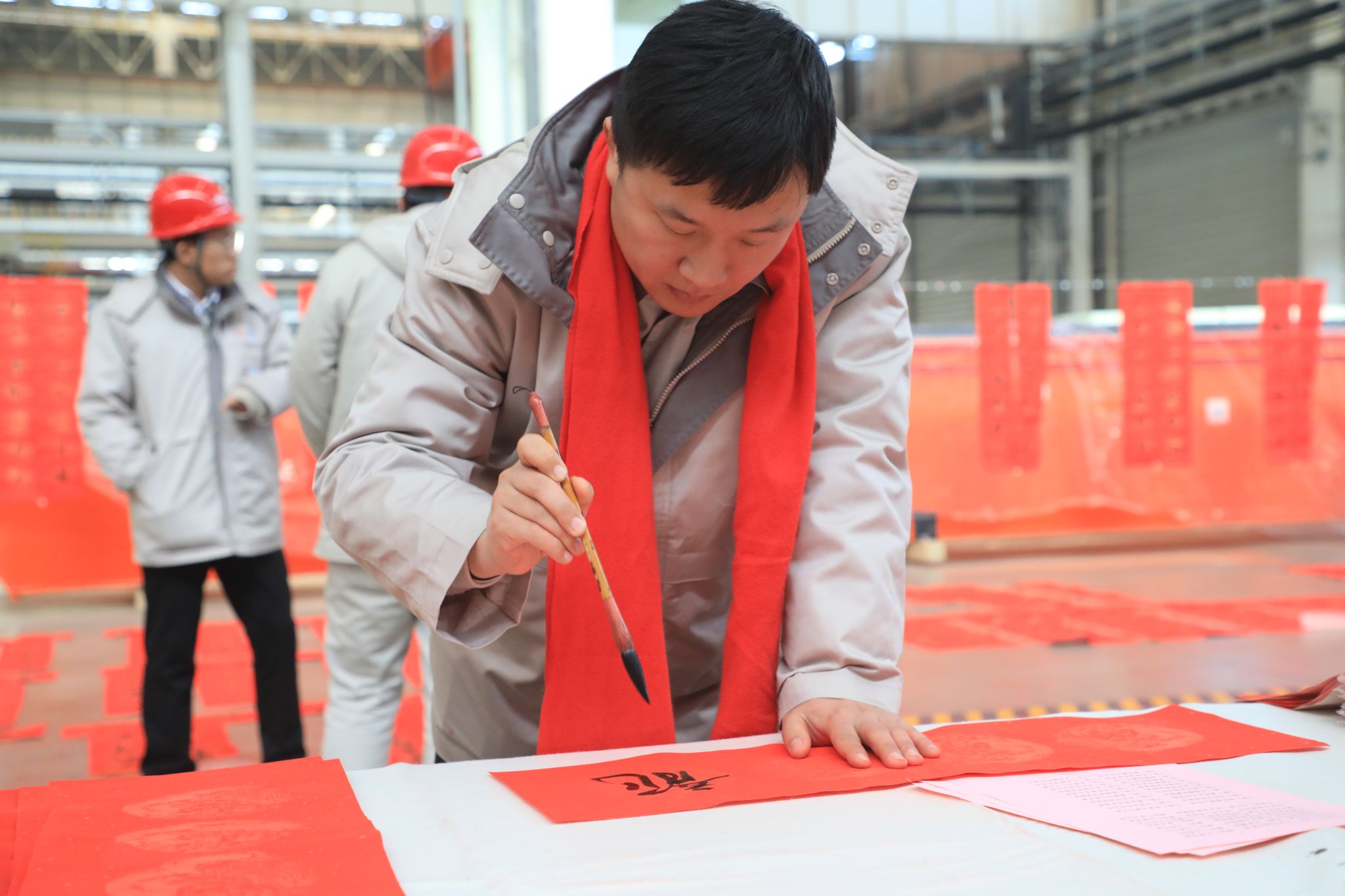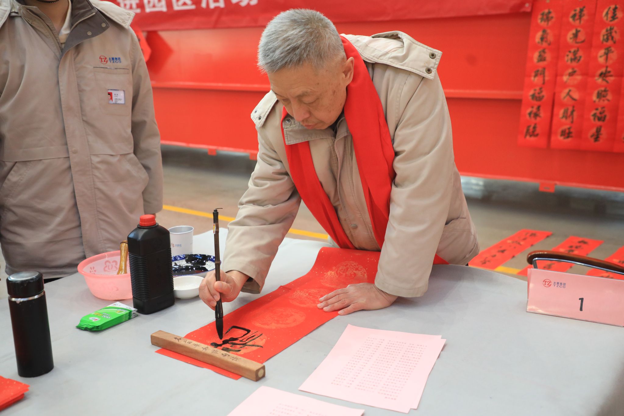 為豐富職工文化生活、喜迎龍年新春,1月23日,公司工會舉辦“迎新春 寫春聯(lián) 送祝?!边M(jìn)園區(qū)活動,在太重智能高端裝備產(chǎn)業(yè)園區(qū)加工裝配聯(lián)合廠房,來自省內(nèi)的知名書法家和公司書法愛好者們齊聚一堂,為各子分公司職工義務(wù)書寫春聯(lián),以這種喜慶的形式向廣大干部職工送上春節(jié)的祝福。集團(tuán)公司黨委專職副書記、副董事長、工會主席張新偉參加活動。