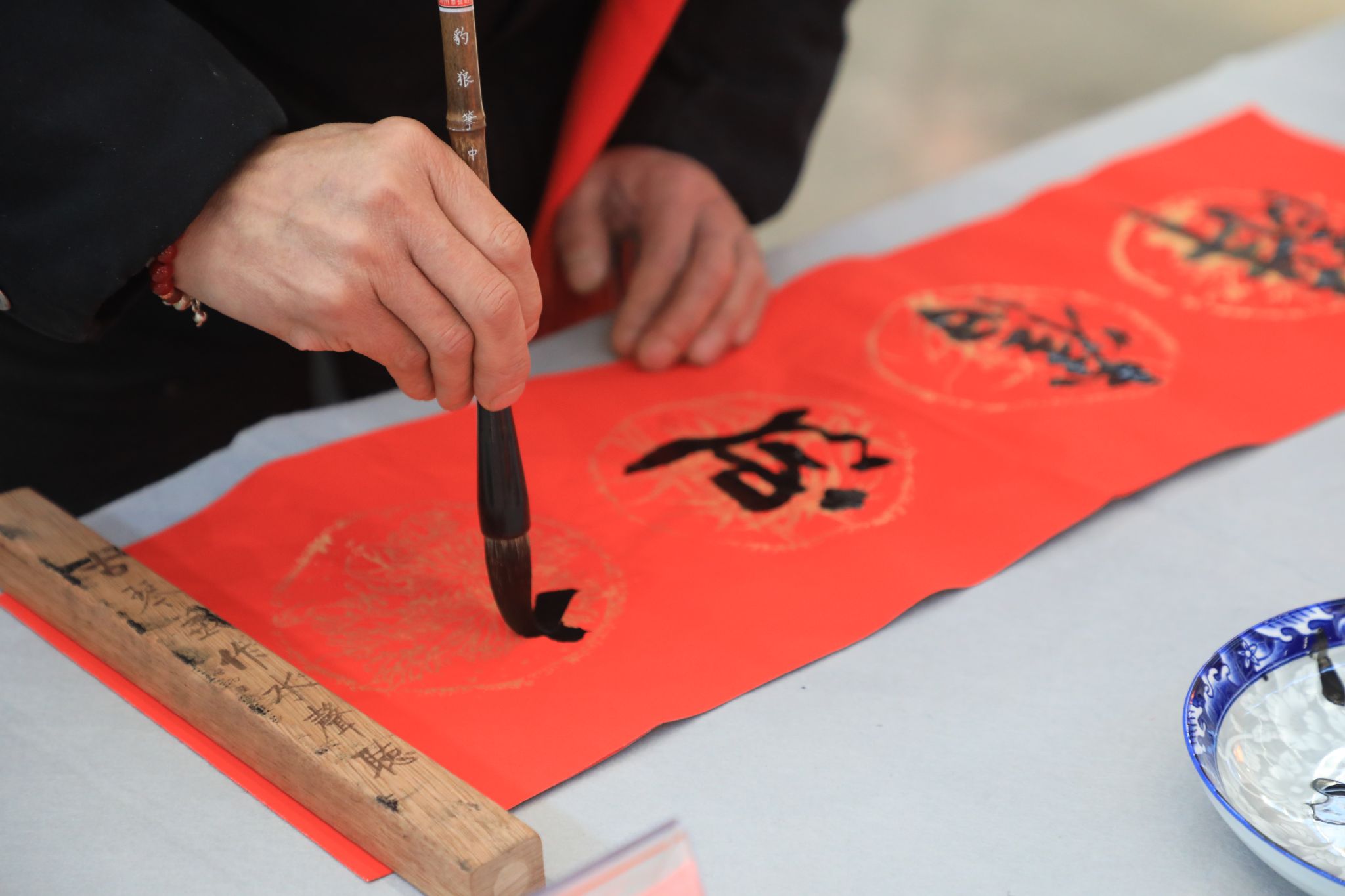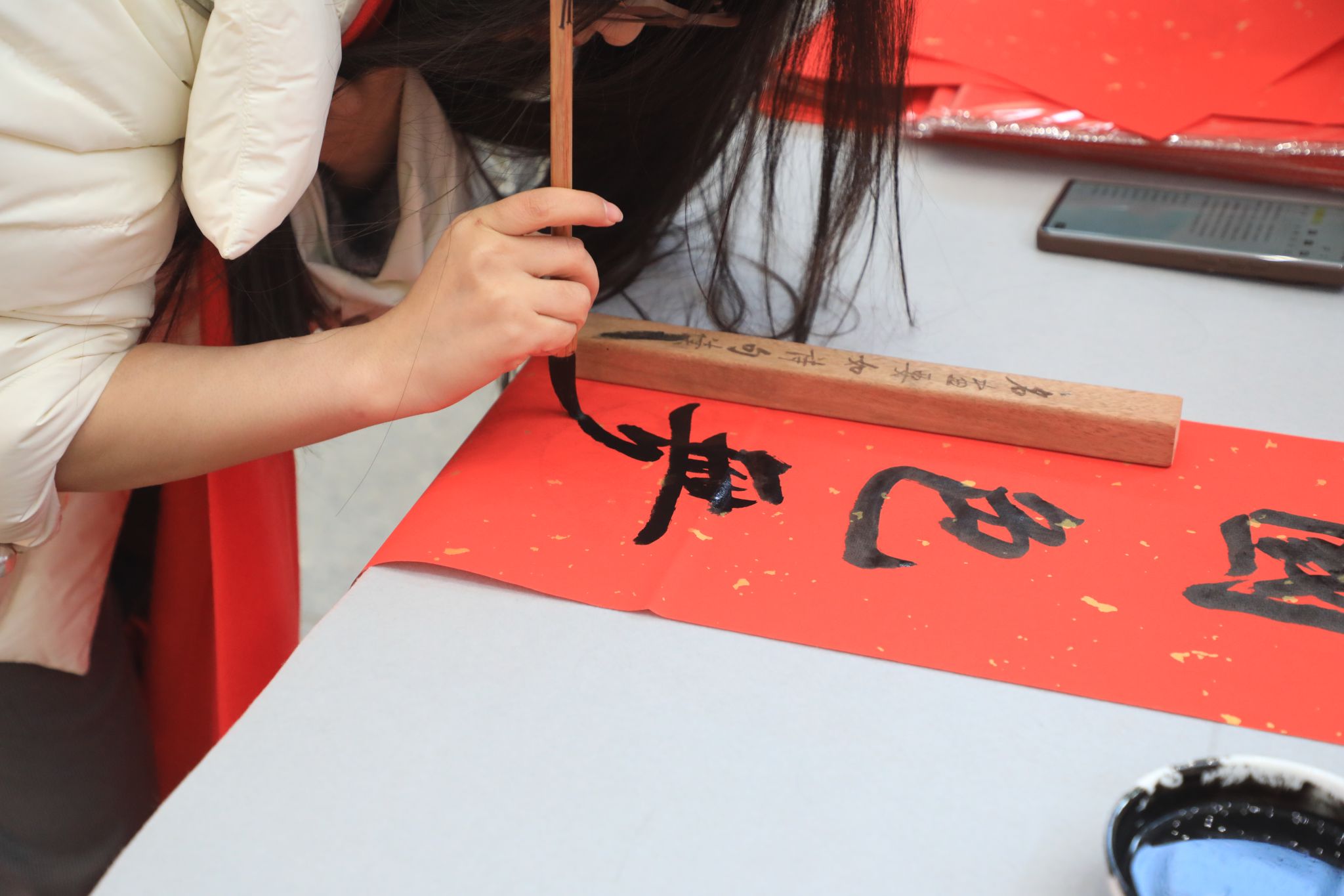 “乘風(fēng)破浪,久久為功,再鑄太重新輝煌;盛世龍騰,挑戰(zhàn)自我,振興崛起太重夢”“一帆風(fēng)順年年好,萬事如意步步高”……鋪紙、蘸墨、起筆,大家揮毫潑墨、激情書寫,在紅彤彤的喜慶與希冀中,將用心挑選的文字用藝術(shù)的形式展現(xiàn)出來,一幅幅遒勁有力、清爽灑脫的新春祝福,帶著清新的墨香躍然紙上。