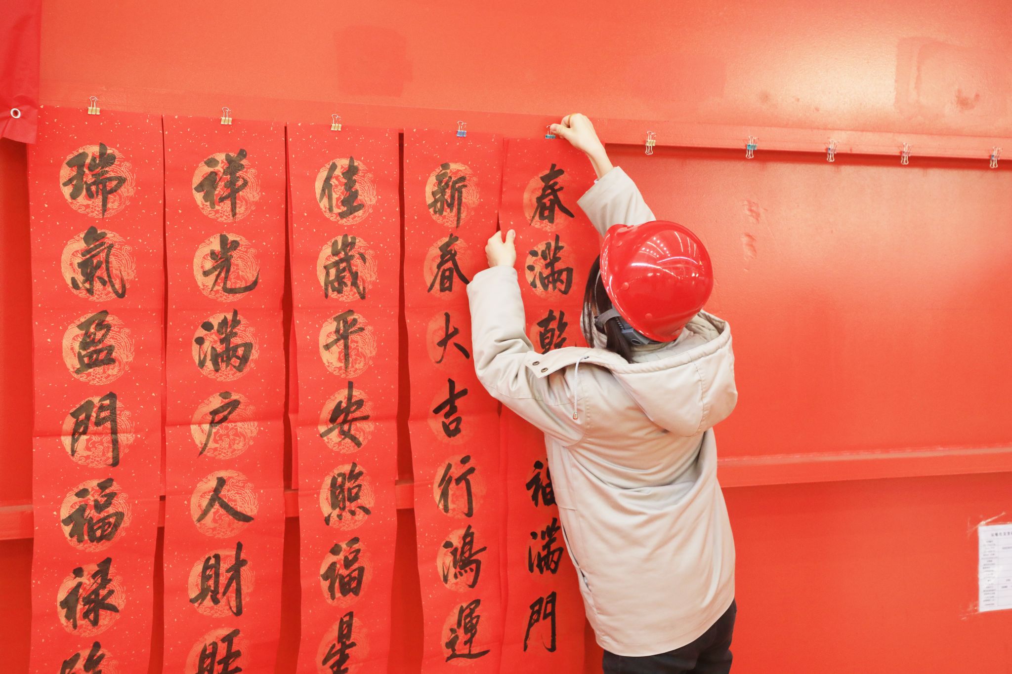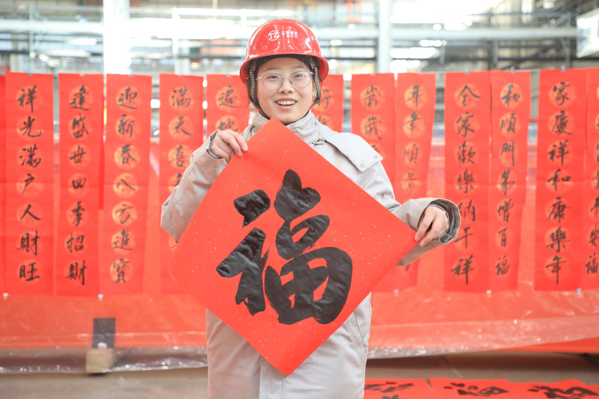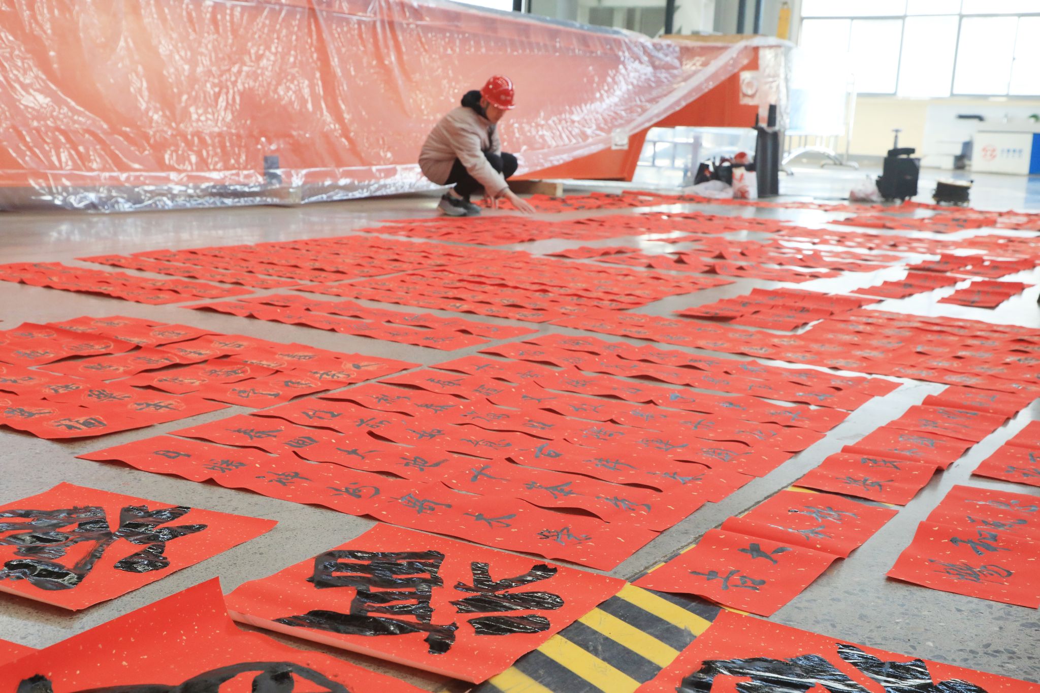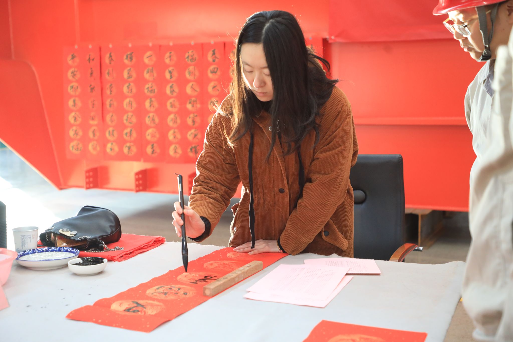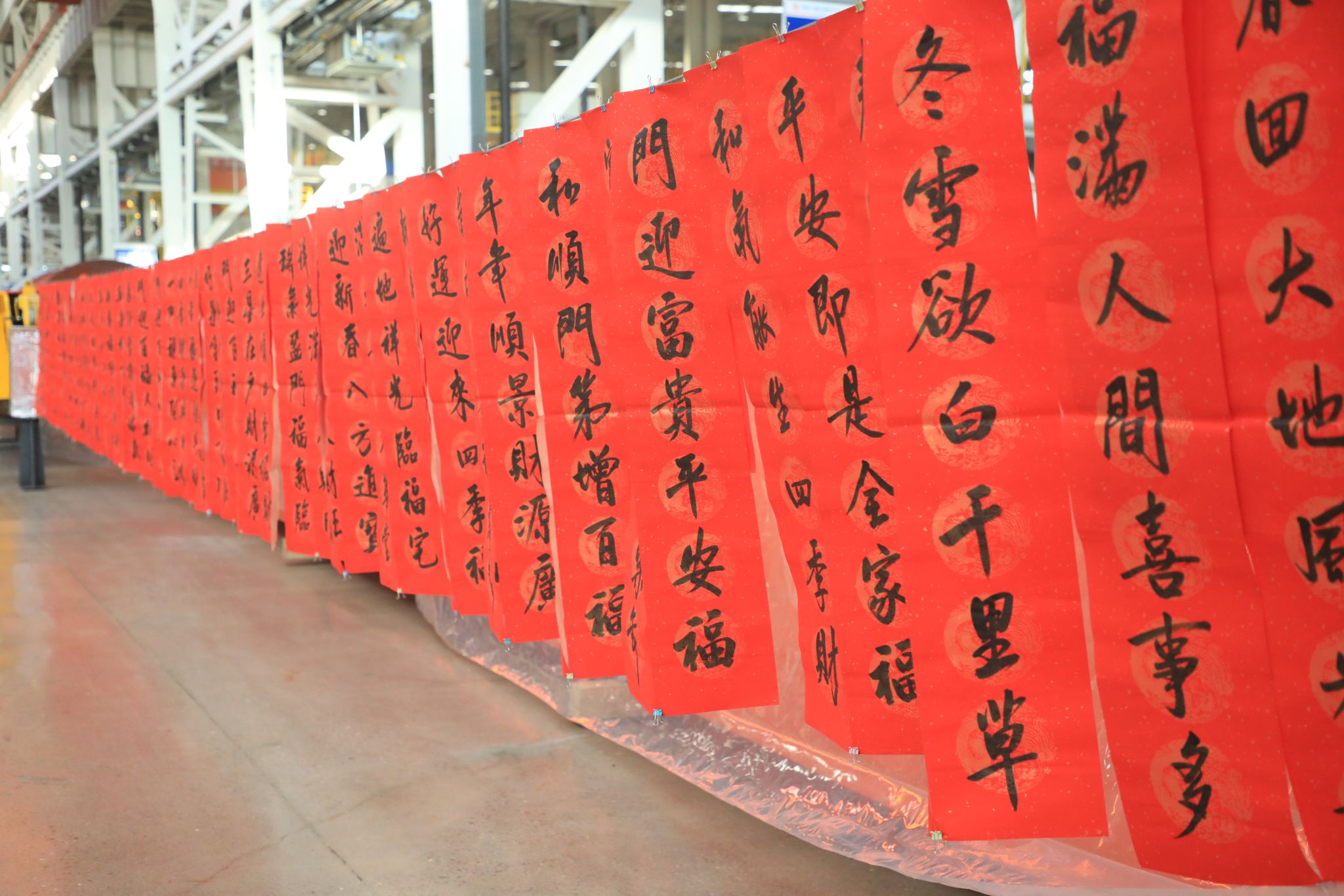 這些“福”氣滿滿的春聯(lián),充滿了對企業(yè)發(fā)展的美好期盼和對未來生活的無限憧憬,透著十足的年味,得到了職工們的熱烈稱贊。不一會兒功夫,桌上、地上就鋪滿了春聯(lián)和“?!弊郑盟埔黄矐c的“紅地毯”。“老師們現(xiàn)場寫春聯(lián),與買春聯(lián)的感覺完全不同,這樣充滿儀式感的活動,讓大家的心里都暖融融的,來年要更加努力在自己的工作崗位上發(fā)光發(fā)熱!”職工們臉上洋溢著燦爛的笑容,開心無比。在現(xiàn)場,書法老師們共書寫春聯(lián)1000余副,并將這些蘊(yùn)含著辛勤汗水、美好祝愿的春聯(lián)送到職工手中,大家紛紛拿起手機(jī)拍照留念,記錄下這幸福的瞬間。