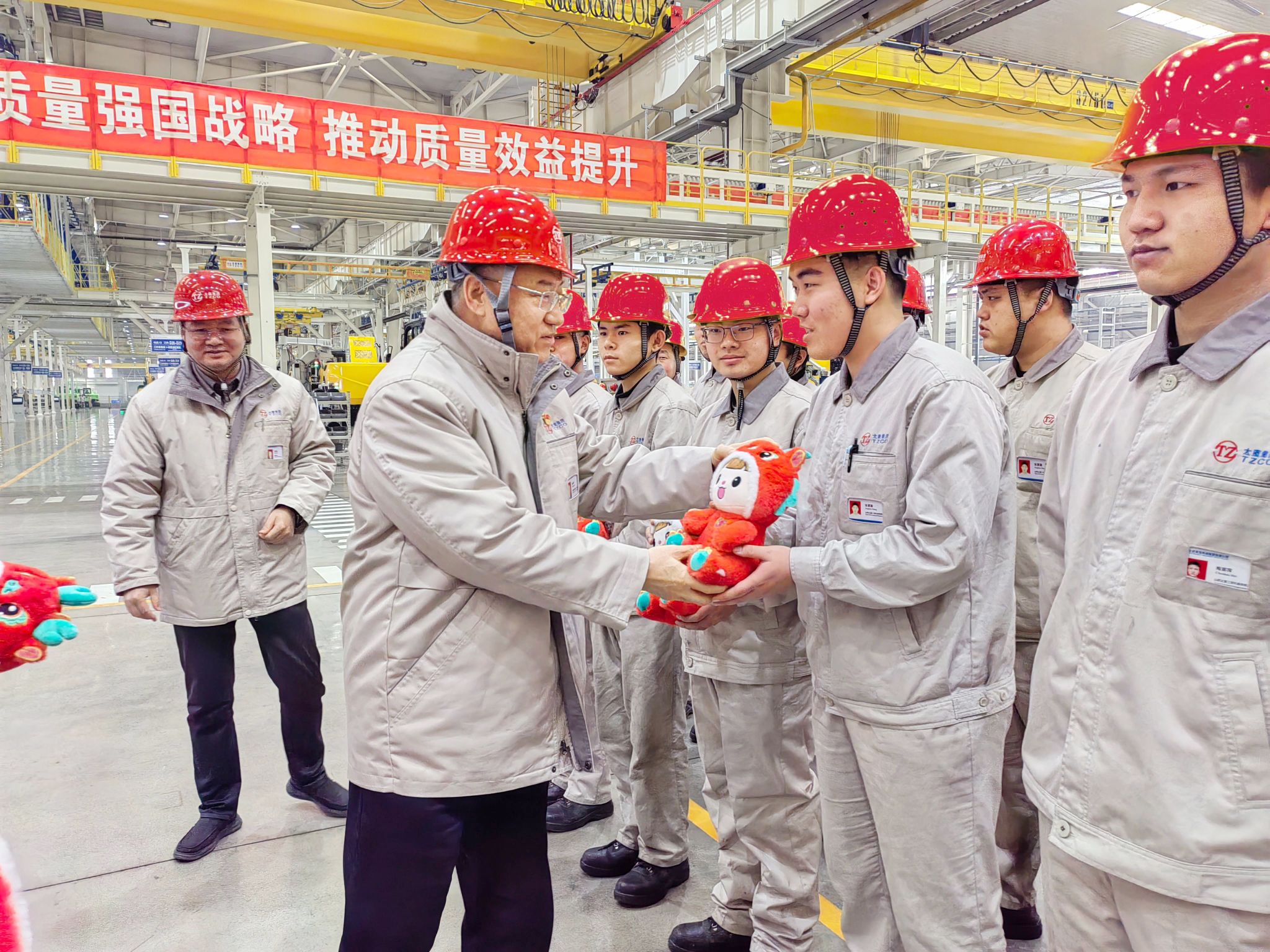 “新春快樂!祝太重蒸蒸日上!”中挖裝配生產(chǎn)現(xiàn)場,職工們個個精神抖擻、意氣風發(fā),齊聲喊出新春祝福。“給大家拜個早年,祝廣大干部職工及職工家屬新年快樂!龍年將至,祝大家龍馬精神、龍騰虎躍!”韓珍堂說,2023年,工程機械公司做了大量卓有成效的工作,對大家的辛勤付出表示感謝,并用“三個快”總結(jié)了一年來取得的成績。建設速度快——從2022年5月開工奠基到2023年7月建成投產(chǎn),14個月時間建成了世界上單一工廠規(guī)模最大、工序最全的挖掘機智慧工廠,創(chuàng)造了同行業(yè)最好水平。新品開發(fā)快——去年共設計完成45款挖機、8款旋挖鉆機,實現(xiàn)0.8-150噸級全系列、多動力覆蓋。融合發(fā)展快——大家因為共同的事業(yè),從五湖四海相聚到一起,專業(yè)人才相互碰撞融合,鑄就了強大的凝聚力、向心力,為公司高質(zhì)量高速度發(fā)展奠定了堅實基礎。韓珍堂強調(diào),今年是公司轉(zhuǎn)型新生的攻堅之年。集團公司發(fā)展任務艱巨繁重,而最艱巨、最繁重的任務還在工程機械公司。只有以批量化作基礎、綠色裝備為底色,我們的工程機械才能更有市場、更有競爭力!打造“規(guī)模化、批量化、效益化”產(chǎn)品,工程機械要率先實現(xiàn);打造“綠色化、智能化、國產(chǎn)化”產(chǎn)品,工程機械也要率先實現(xiàn)!要開疆拓土,打造國際化公司,讓太重產(chǎn)品、太重品牌揚帆出海、遍布世界舞臺。要對標學習、超越先進、成為先進,打造引領機械行業(yè)最高水平的智慧工廠!這是對大家的期望,也是全體太重人要為之奮斗的目標!字字懇切、句句提氣又溫情滿滿。隨后韓珍堂將新年吉祥物一一送至職工手中。現(xiàn)場的干部職工深受鼓舞、倍感振奮,在溫暖中收獲了奮進的力量,更加堅定了未來努力的方向。大家紛紛表示,將進一步增強責任感、使命感,認真履職盡責、主動擔當作為,爭做轉(zhuǎn)型發(fā)展的排頭兵,為實現(xiàn)振興崛起的“太重夢”不懈奮斗!