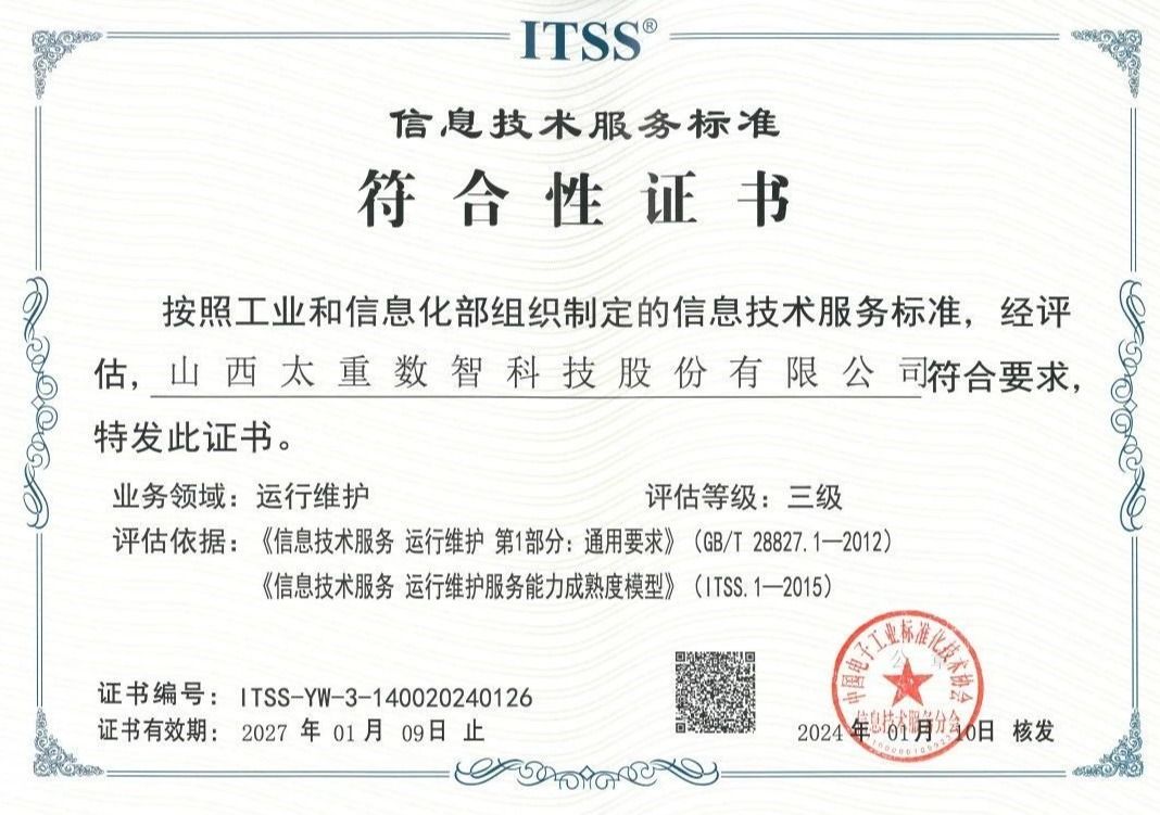 經過中國電子工業(yè)標準化技術協(xié)會信息技術服務分會的評估,近日,太重數(shù)智公司順利通過ITSS信息技術服務標準符合性評估三級認證(運維服務),獲得《信息技術服務運行維護標準符合性認證證書》。這標志著數(shù)智公司在運維服務能力和服務標準化體系建設方面,獲得了國家級資質認證,對于向內保障太重數(shù)實融合升級、向外開拓數(shù)智服務市場,都具有重要意義。