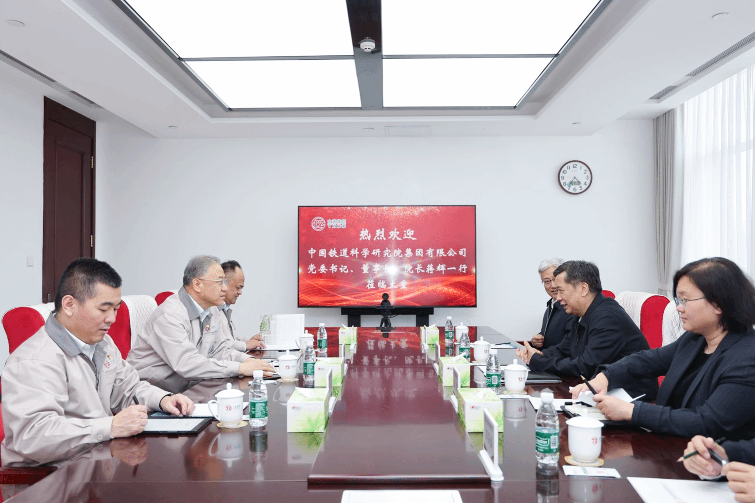 龍城四月天,春色正當(dāng)時(shí)。4月17日,集團(tuán)公司黨委書記、董事長(zhǎng)韓珍堂熱情接待了中國(guó)鐵道科學(xué)研究院集團(tuán)有限公司黨委書記、董事長(zhǎng)、院長(zhǎng)蔣輝一行,雙方就進(jìn)一步把握發(fā)展新趨勢(shì)、謀求合作新機(jī)遇,合力推動(dòng)我國(guó)軌道交通產(chǎn)業(yè)高質(zhì)量發(fā)展進(jìn)行深入交流。