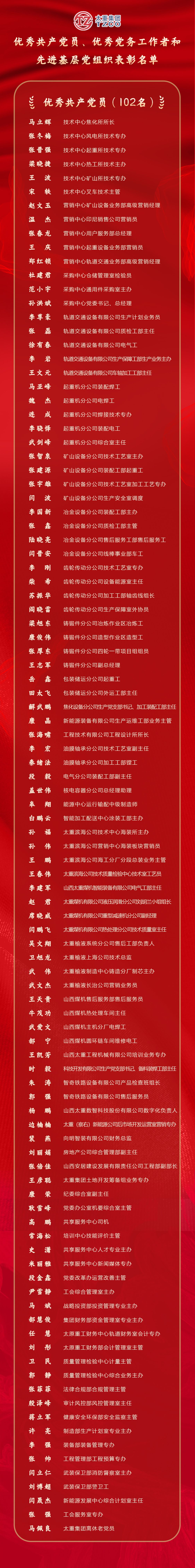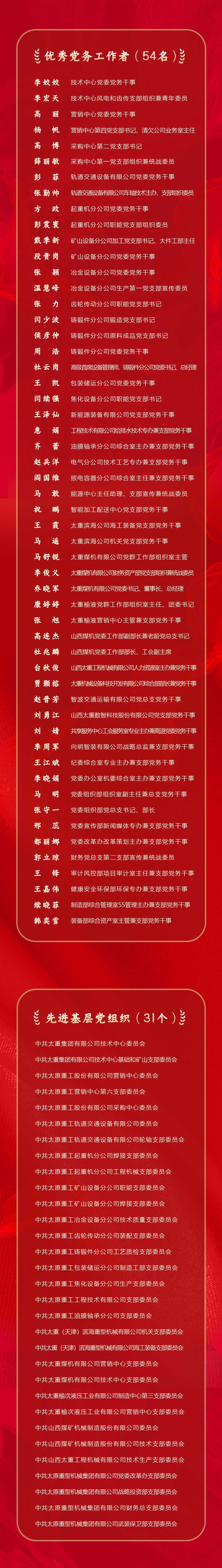 授予宋軼、鄭紅鎖等102名同志“優(yōu)秀共產(chǎn)黨員”稱號,授予張勤帥、高博、李宏天等54名同志“優(yōu)秀黨務工作者”稱號,授予中共太原重工油膜軸承分公司支部委員會、中共太原重型機械集團有限公司財務總支部委員會、中共太重集團有限公司技術(shù)中心委員會等31個黨組織“先進基層黨組織”稱號。