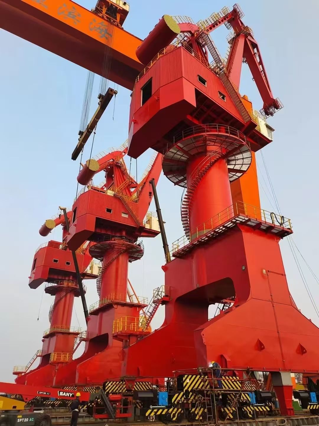 門座式起重機(jī),作為高效的全回轉(zhuǎn)臂架型有軌起重機(jī),服務(wù)于港口裝卸及造船施工,是港口作業(yè)的主力設(shè)備。為滿足用戶實(shí)際使用要求,三臺門座式起重機(jī)均搭載起重機(jī)監(jiān)測管理平臺——CMS系統(tǒng)。它作為港口機(jī)械的“智能管家”,可為用戶提供詳盡、實(shí)時(shí)的起重機(jī)狀態(tài)和故障信息,是協(xié)助用戶實(shí)現(xiàn)設(shè)備高效使用、故障檢測和信息化管理的重要手段。以成熟的技術(shù)打造卓越方案,性能優(yōu)越、高效穩(wěn)定,盡顯公司硬核實(shí)力。總裝發(fā)運(yùn)期間,公司與技術(shù)團(tuán)隊(duì)、用戶緊密協(xié)作,創(chuàng)新采用雙作業(yè)面策略,降低地面化組裝難度,安裝效率顯著提升。歷經(jīng)15天晝夜奮戰(zhàn),成功完成3臺起重機(jī)的核心部件總裝,單臺設(shè)備四連桿安裝更是創(chuàng)下13.5小時(shí)新紀(jì)錄,彰顯了太重速度。有條不紊地吊裝作業(yè)、聚精會神地滾裝發(fā)運(yùn)……工作人員精益生產(chǎn)、高效組織,經(jīng)過100多天的默默付出后,“馴養(yǎng)員”終于讓這三只“機(jī)械鶴”振翅離巢,向用戶“飛”去。