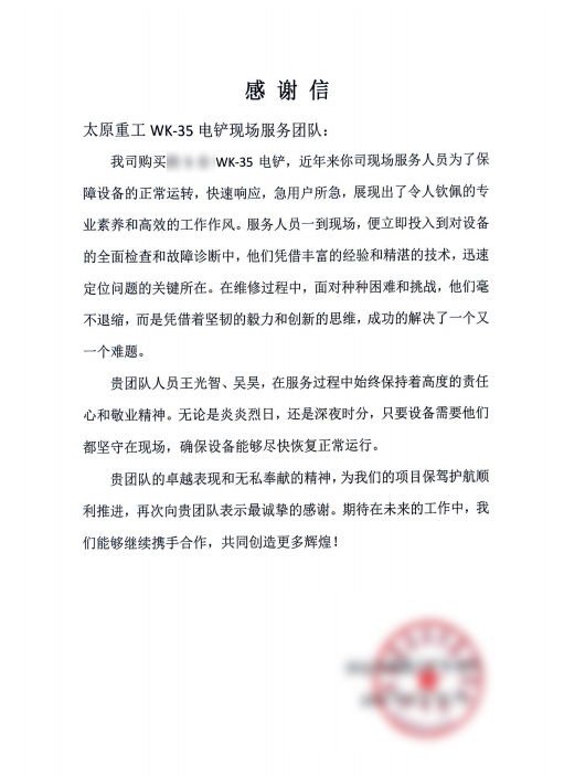 熱忱的服務(wù)態(tài)度和精湛的技術(shù)水平深受用戶贊賞:“方向準(zhǔn)、行動(dòng)快、效果實(shí)!我們見(jiàn)證了太重速度,體會(huì)了太重服務(wù),讓人十分信賴(lài)?!庇脩舳啻卧诂F(xiàn)場(chǎng)感慨道。帶著感情去工作,帶著責(zé)任去執(zhí)行。每一封感謝信與每一面錦旗,都流露出用戶對(duì)公司卓越服務(wù)的認(rèn)可與贊譽(yù)。未來(lái),公司將不斷加大后市場(chǎng)的服務(wù)力度,優(yōu)化服務(wù)流程、提升服務(wù)質(zhì)量、提供最優(yōu)解決方案,以超預(yù)期的服務(wù)與價(jià)值持續(xù)加強(qiáng)產(chǎn)品核心競(jìng)爭(zhēng)力。