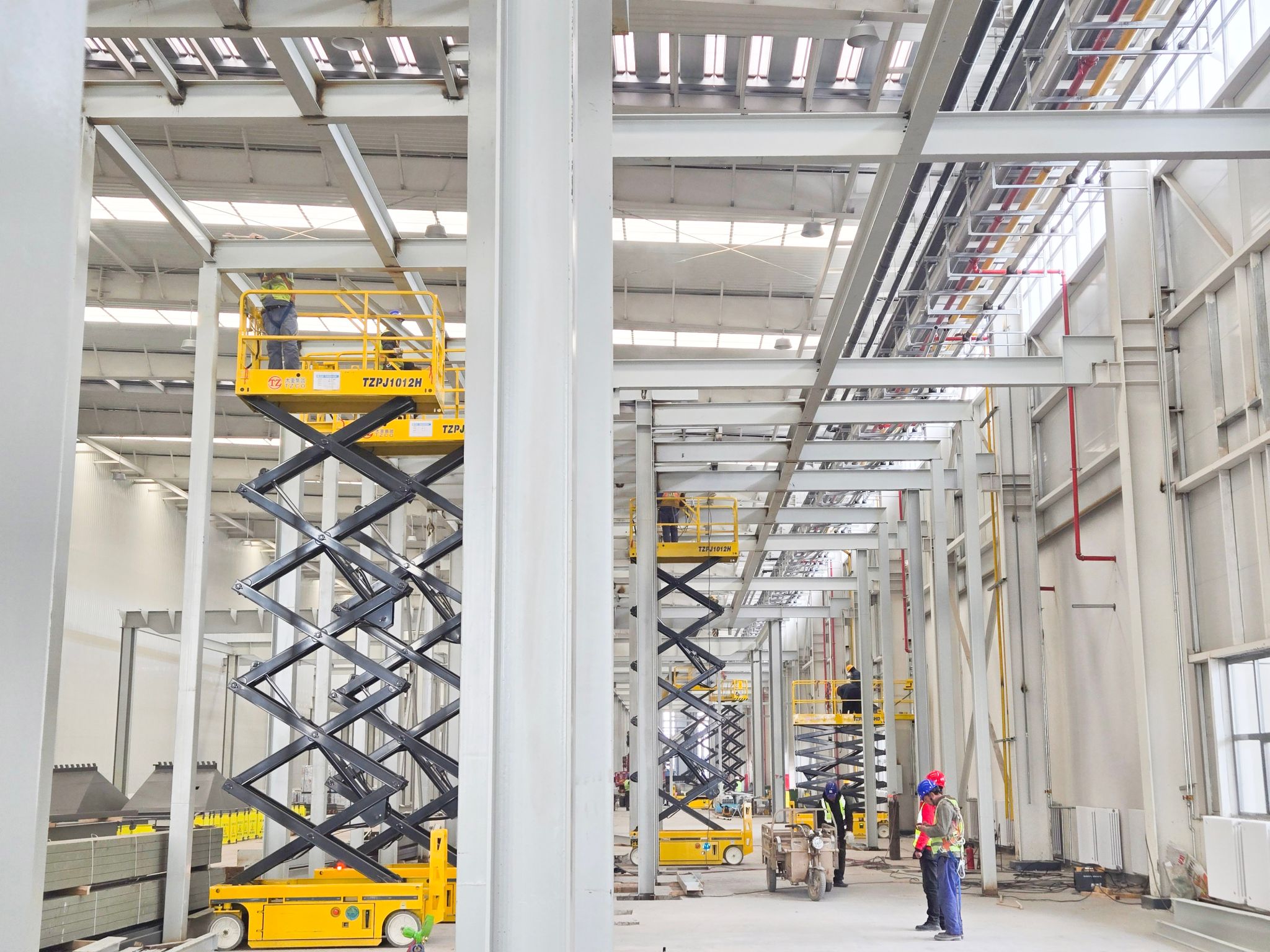 高端產(chǎn)線亮點紛呈,太重裝備在其中忙得“不亦樂乎”。聯(lián)合廠房內(nèi),太重研制的高空作業(yè)平臺隨處可見,隨車起重機更是以其靈活的特性在廠房完善中發(fā)揮著關鍵作用。一位現(xiàn)場施工人員感慨道:“太重直臂車、剪叉車成為我們的得力幫手,用自己的一流產(chǎn)品,造自己的一流園區(qū),相信園區(qū)建成之后,太重工程起重機產(chǎn)品的性能只會更好!”