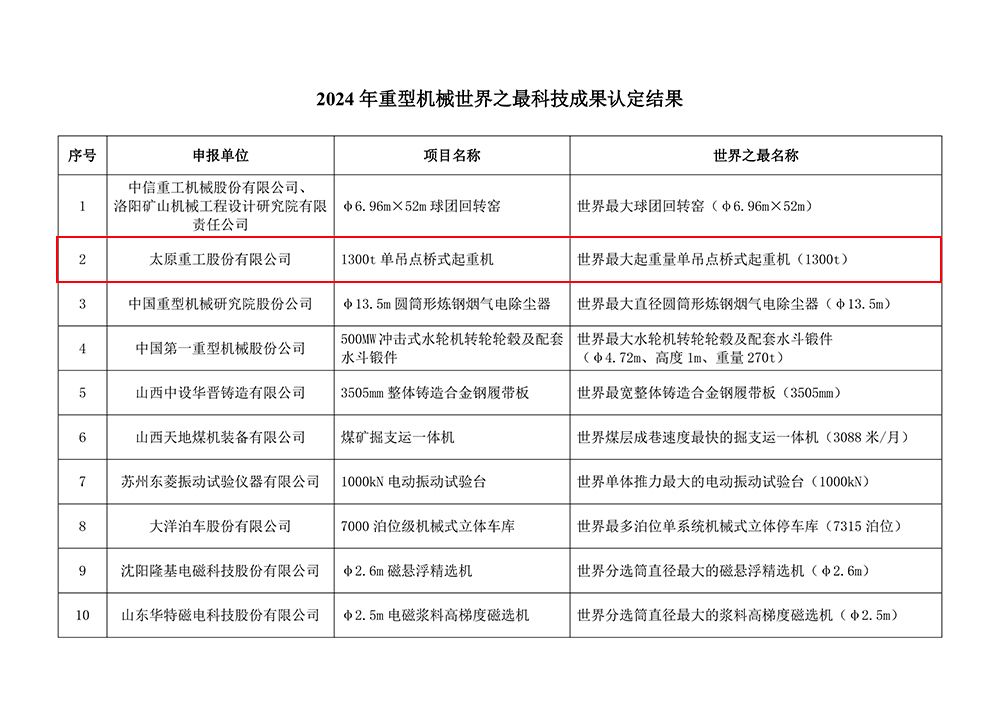 本次“重型機(jī)械世界之最科技成果”認(rèn)定,全國(guó)共有10項(xiàng)成果入選,要求項(xiàng)目突破關(guān)鍵技術(shù)壁壘,達(dá)到或超過(guò)國(guó)際先進(jìn)水平,并至少有一項(xiàng)關(guān)鍵技術(shù)指標(biāo)創(chuàng)造同類產(chǎn)品的世界之最。太重1300t橋式起重機(jī)榮登世界之巔,背后是“共和國(guó)長(zhǎng)子”深耕起重機(jī)領(lǐng)域數(shù)十年的深厚積淀,也是太重科技工作者矢志創(chuàng)新、重器報(bào)國(guó)的不懈追求,充分展示了太重在起重機(jī)領(lǐng)域無(wú)可爭(zhēng)議的領(lǐng)先地位,也為我國(guó)大型起重機(jī)的設(shè)計(jì)制造蹚出了一條新路。