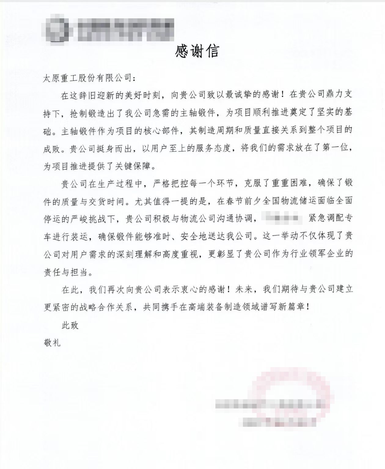 在這場(chǎng)緊急交付的“戰(zhàn)役”中,全體職工齊心協(xié)力、眾志成城,為用戶提供了最優(yōu)質(zhì)的產(chǎn)品及全方位的服務(wù),有力踐行了“用戶至上”的核心價(jià)值觀。這封感謝信,是太重一諾千金的見(jiàn)證,是用戶信任與支持太重品牌的最好詮釋。未來(lái),公司將持續(xù)奮進(jìn),不斷提升服務(wù)質(zhì)量,深入踐行服務(wù)創(chuàng)新,以極致服務(wù)贏得用戶信賴,與合作伙伴攜手共進(jìn)、互利共贏,共同書寫合作發(fā)展的新篇章。