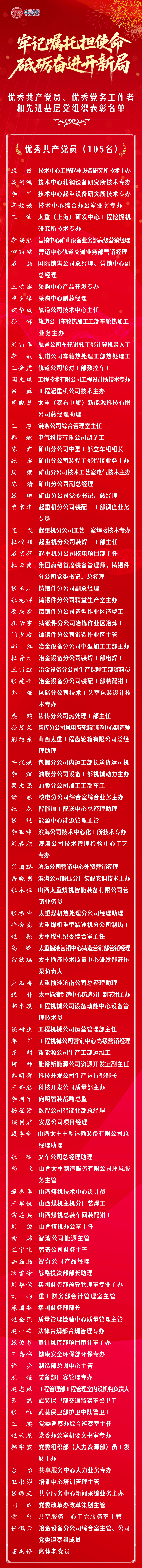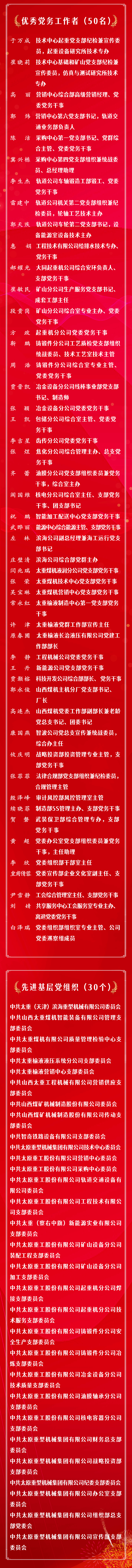 今年是中國共產(chǎn)黨成立104周年,同時迎來了太重建廠75周年。在公司“追趕超越”的新征程上,涌現(xiàn)出了一批優(yōu)秀共產(chǎn)黨員、優(yōu)秀黨務(wù)工作者和先進(jìn)基層黨組織,發(fā)揮了中流砥柱作用。為激勵各級黨組織和廣大黨員進(jìn)一步擔(dān)當(dāng)作為、建功立業(yè),公司黨委決定: