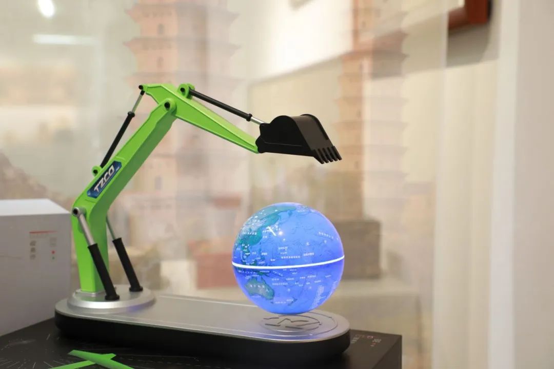 以明星產(chǎn)品氫能源挖掘機(jī)為原型,使用磁懸浮先進(jìn)技術(shù),托起空中的蔚藍(lán)星球。重型機(jī)械的磅礴力量在此升華為桌面空間的科技美學(xué),生動(dòng)訴說(shuō)著太重“掘勝全球”的壯志——以智能化與綠色化駛向全球大市場(chǎng)!