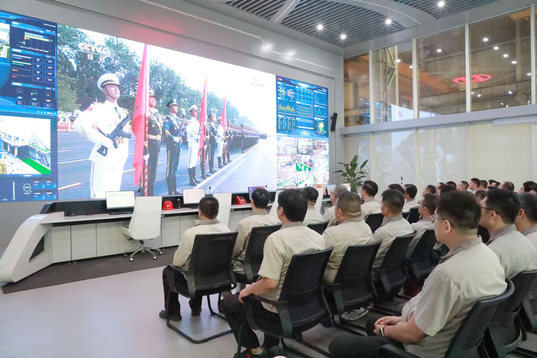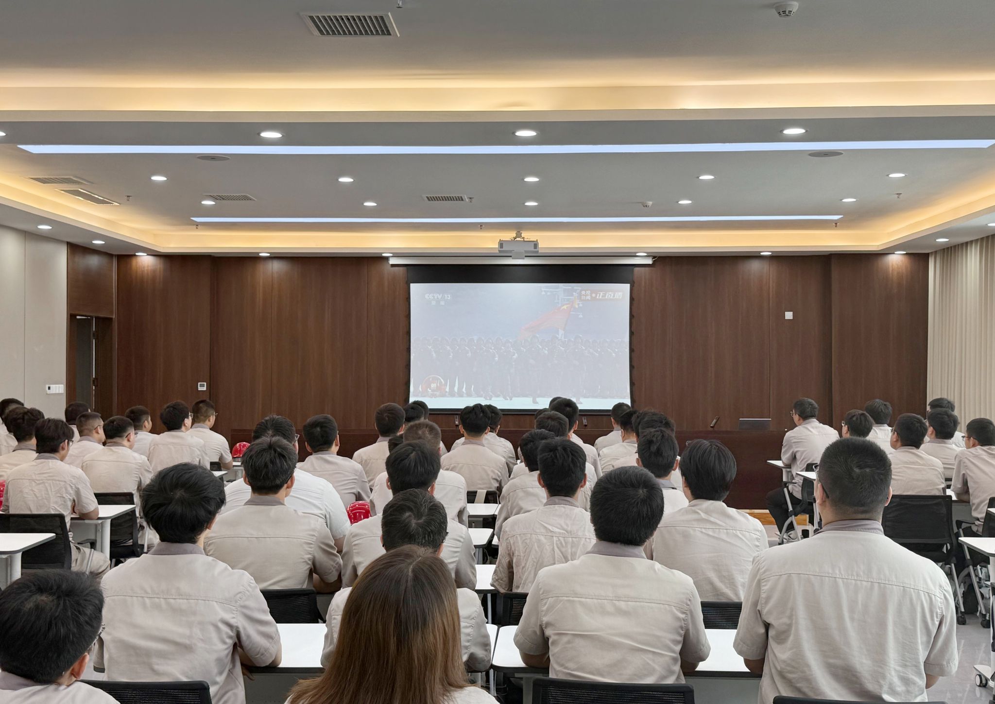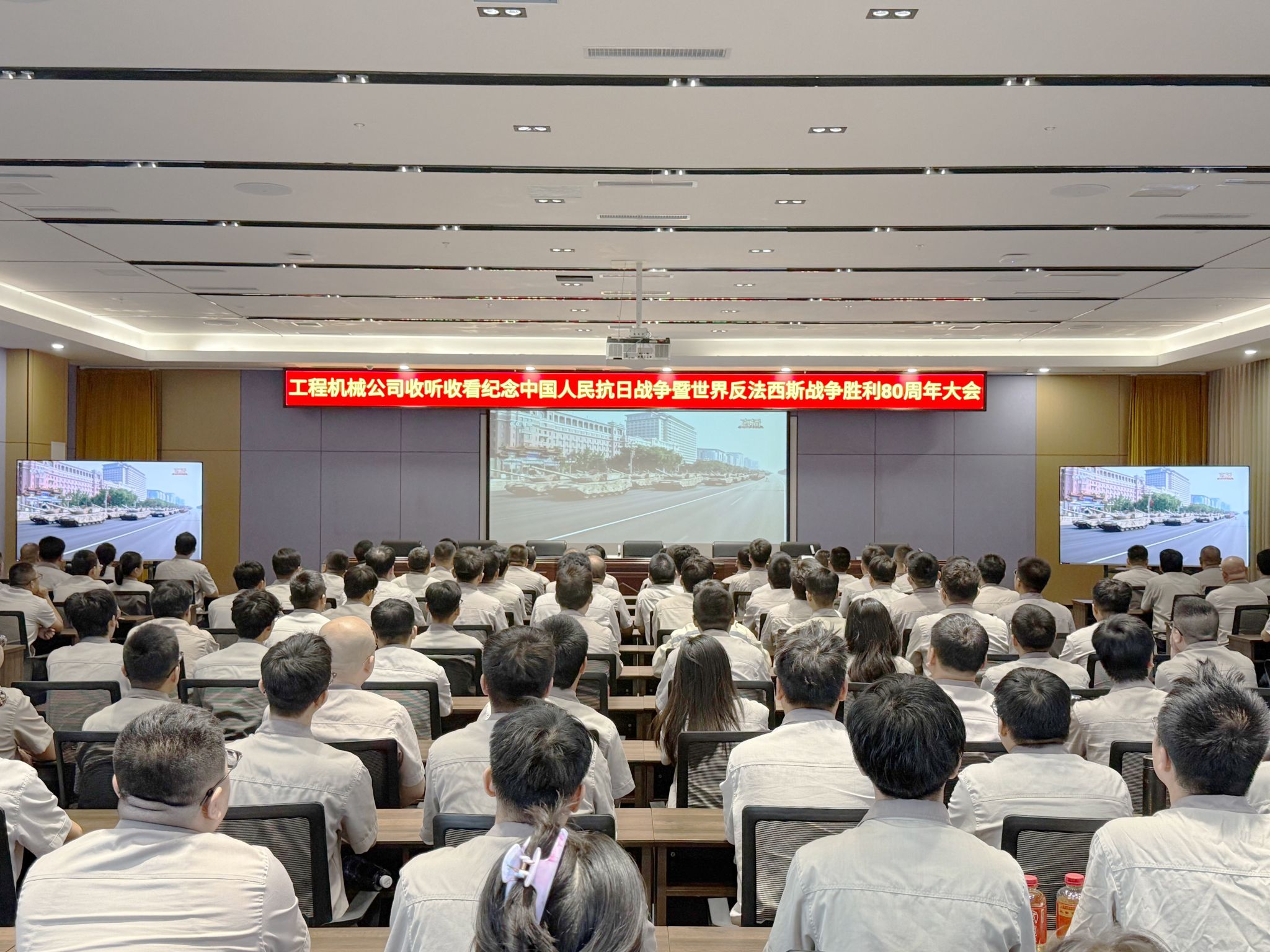 在集團總部報告廳,集團公司領導與各部門職工代表齊聚,集中收聽收看大會實況直播,共同聆聽感悟習近平總書記發(fā)表的重要講話,深刻體會講話中蘊含的歷史意義與時代價值,見證這一莊嚴而光輝的歷史時刻,愛國情懷在太重激蕩,奮斗熱情在每一位職工心中點燃。