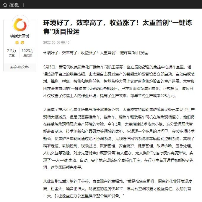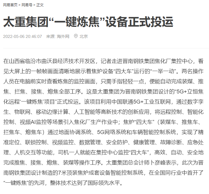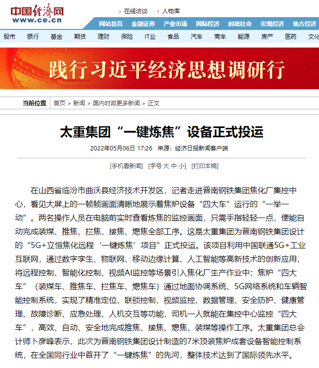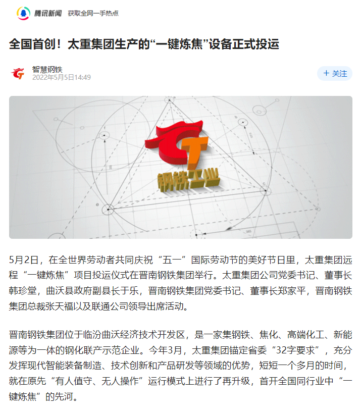 央廣網(wǎng)、中國鋼鐵新聞網(wǎng)、騰訊以《全國首創(chuàng)!太重集團(tuán)“一鍵煉焦”設(shè)備正式投運(yùn)》為題,聚焦太重集團(tuán)以科技創(chuàng)新激發(fā)“智造”新活力為出發(fā)點(diǎn),全面展示“智能+5G”在“一鍵煉焦”上的應(yīng)用,助力焦化領(lǐng)域效能提升、節(jié)能降耗和轉(zhuǎn)型升級(jí)。中國經(jīng)濟(jì)網(wǎng)、網(wǎng)易、山西國資以《太重集團(tuán)“一鍵煉焦”設(shè)備正式投運(yùn)》為題,報(bào)道太重集團(tuán)“一鍵煉焦”項(xiàng)目正式開啟智能煉焦新時(shí)代,填補(bǔ)技術(shù)空白,開創(chuàng)國內(nèi)焦化行業(yè)先河。搜狐網(wǎng)以《環(huán)境好了,效率高了,收益漲了!太重首創(chuàng)“一鍵煉焦”項(xiàng)目投運(yùn)》為題,重點(diǎn)展示了太重集團(tuán)“一鍵煉焦”項(xiàng)目成果,實(shí)現(xiàn)智能綠色工廠轉(zhuǎn)型再升級(jí)。山西日?qǐng)?bào)、山西晚報(bào)、太原日?qǐng)?bào)分別以《首開全國同行業(yè)先河!太重“一鍵煉焦”項(xiàng)目投入運(yùn)行》《太重大發(fā)明:動(dòng)動(dòng)手指“一鍵煉焦”》《太重首創(chuàng)“一鍵煉焦”項(xiàng)目投運(yùn)》為題,聚焦太重“智造”再提速,充分展現(xiàn)公司以“三性五化”為新產(chǎn)品開發(fā)目標(biāo),助力國家實(shí)現(xiàn)“雙碳”目標(biāo)。