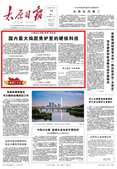 9月14日,太原日?qǐng)?bào)頭版頭條《喜迎二十大》專(zhuān)欄,刊發(fā)文章《太重焦化突破“瓶頸”創(chuàng)效益 國(guó)內(nèi)最大搗固焦?fàn)t里的硬核科技》,報(bào)道太重集團(tuán)聚焦“雙碳”目標(biāo),加快培育能源科技創(chuàng)新領(lǐng)域新路徑,從具備制造國(guó)際先進(jìn)水平焦?fàn)t機(jī)械成套設(shè)備能力,到首開(kāi)“一鍵煉焦”技術(shù)先河,再到研發(fā)出全國(guó)最大的智能搗固焦?fàn)t設(shè)備,“核心技術(shù)”的自主創(chuàng)新和“卡脖子”問(wèn)題的逐個(gè)攻破,推動(dòng)了我國(guó)焦化裝備制造在國(guó)際市場(chǎng)上從跟跑、并跑到領(lǐng)跑的跨越。