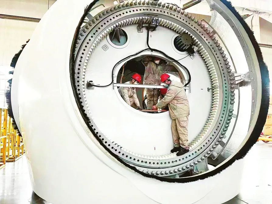 新能源公司風電整機裝配車間內(nèi),裝配工正在進行輪轂內(nèi)裝作業(yè)