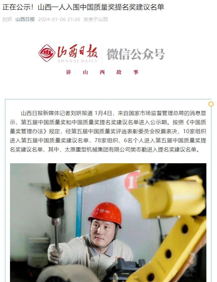 1月4日,來自國家市場監(jiān)督管理總局的消息顯示,第五屆中國質(zhì)量獎(jiǎng)和中國質(zhì)量獎(jiǎng)提名獎(jiǎng)建議名單進(jìn)入公示期。按照《中國質(zhì)量獎(jiǎng)管理辦法》規(guī)定,經(jīng)第五屆中國質(zhì)量獎(jiǎng)評(píng)選表彰委員會(huì)投票表決,10家組織進(jìn)入第五屆中國質(zhì)量獎(jiǎng)建議名單,78家組織、6名個(gè)人進(jìn)入第五屆中國質(zhì)量獎(jiǎng)提名獎(jiǎng)建議名單,其中,太原重型機(jī)械集團(tuán)有限公司樊志勤進(jìn)入提名獎(jiǎng)建議名單。