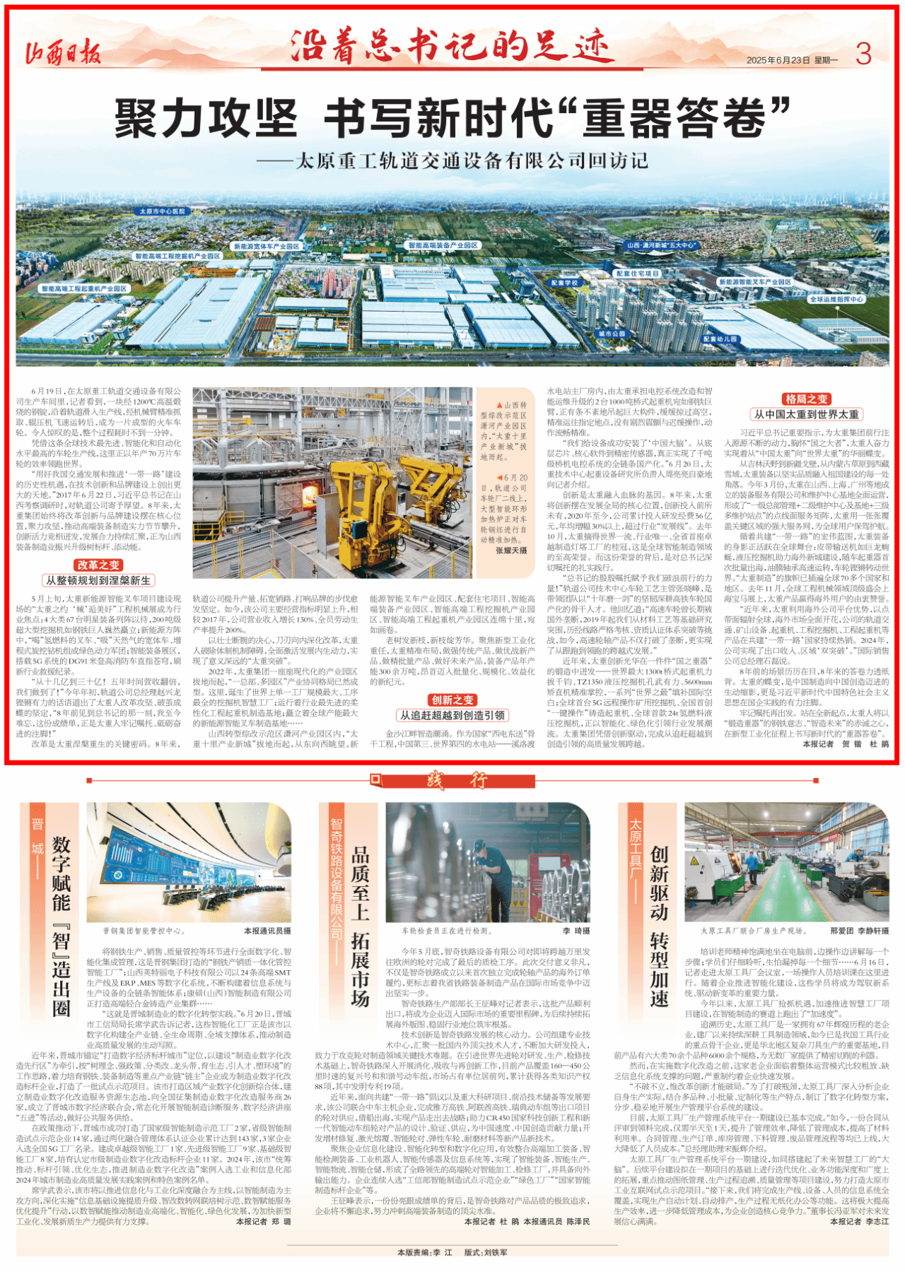 在習(xí)近平總書記考察調(diào)研太重八周年之際,山西新聞聯(lián)播、山西日?qǐng)?bào)【沿著總書記的足跡】專欄聚焦太重,感知公司“智”造高地的澎湃動(dòng)能,展現(xiàn)太重的改革之變、創(chuàng)新之變、格局之變,見證太重人加速競(jìng)跑的具體實(shí)踐!