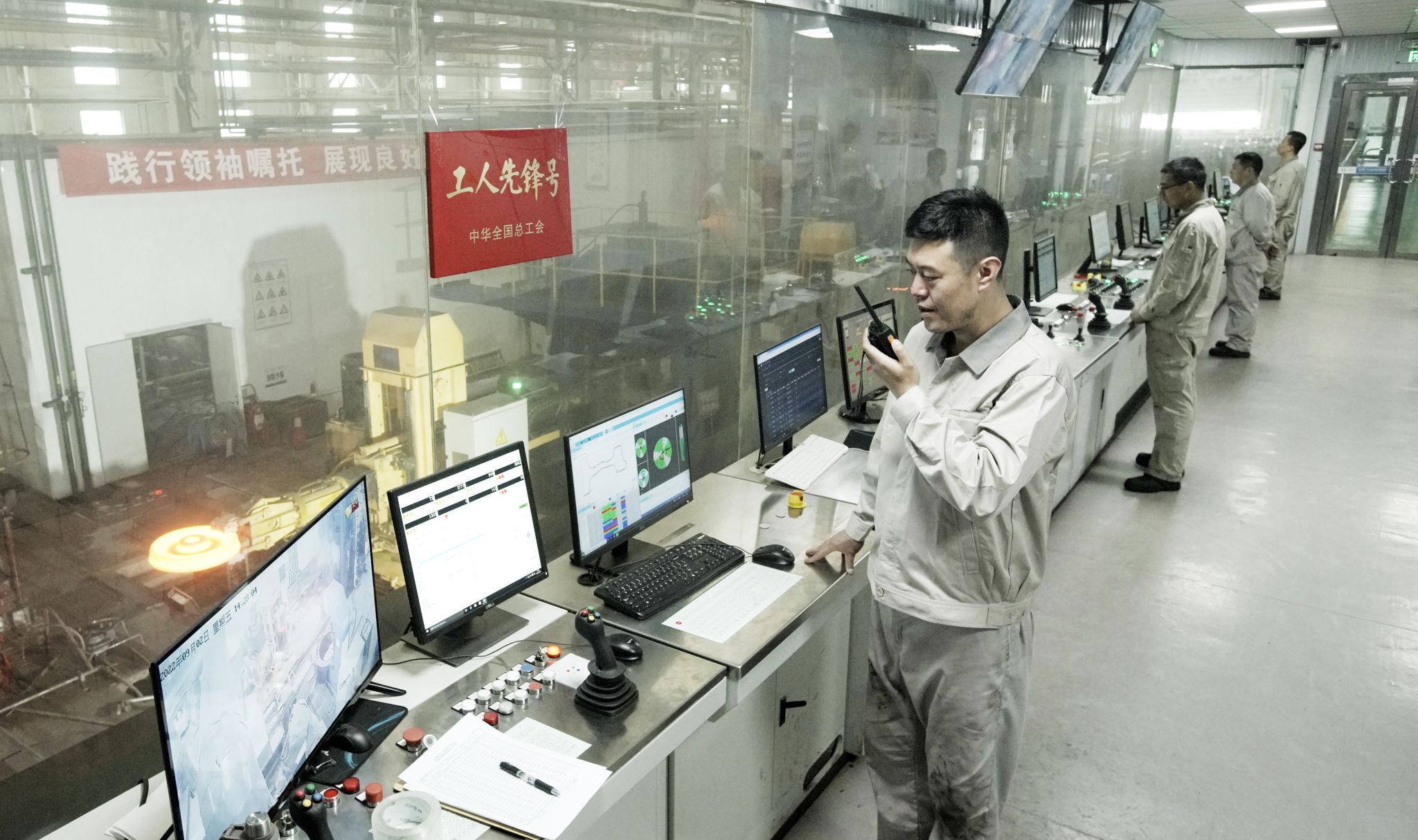 鍛熱工部負(fù)責(zé)車輪的加熱、預(yù)成型、成型、沖孔、軋制和壓彎及車輪擴(kuò)氫、退火、淬火、正火和回火等工序。2019年鍛熱工部共生產(chǎn)車輪總數(shù)18萬(wàn)件左右,超額完成俄羅斯8萬(wàn)余件車輪交貨任務(wù)。2020年不斷優(yōu)化浸入式淬火臺(tái)滿足美國(guó)輪箍的生產(chǎn)和交貨需求,對(duì)噴淋淬火臺(tái)進(jìn)行升級(jí)改造。2021年工部不斷統(tǒng)籌安排,合理優(yōu)化設(shè)計(jì),自發(fā)組成突擊隊(duì),保證了項(xiàng)目“當(dāng)年立項(xiàng)、當(dāng)年實(shí)施、當(dāng)年投產(chǎn)”,其中中徑14米環(huán)形爐僅用時(shí)85天順利交付使用,第一片熱軋車輪于2021年12月31日成功下線。